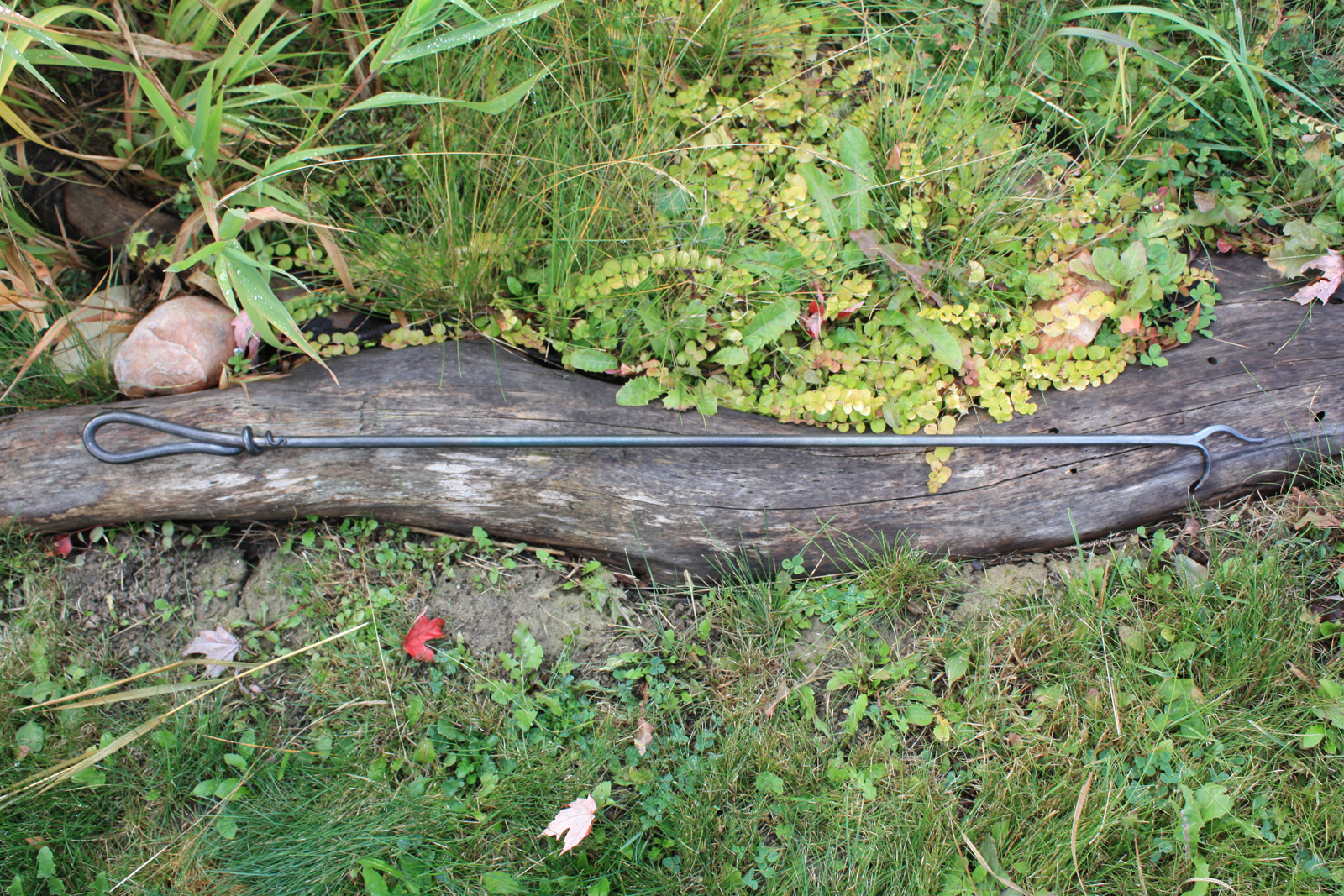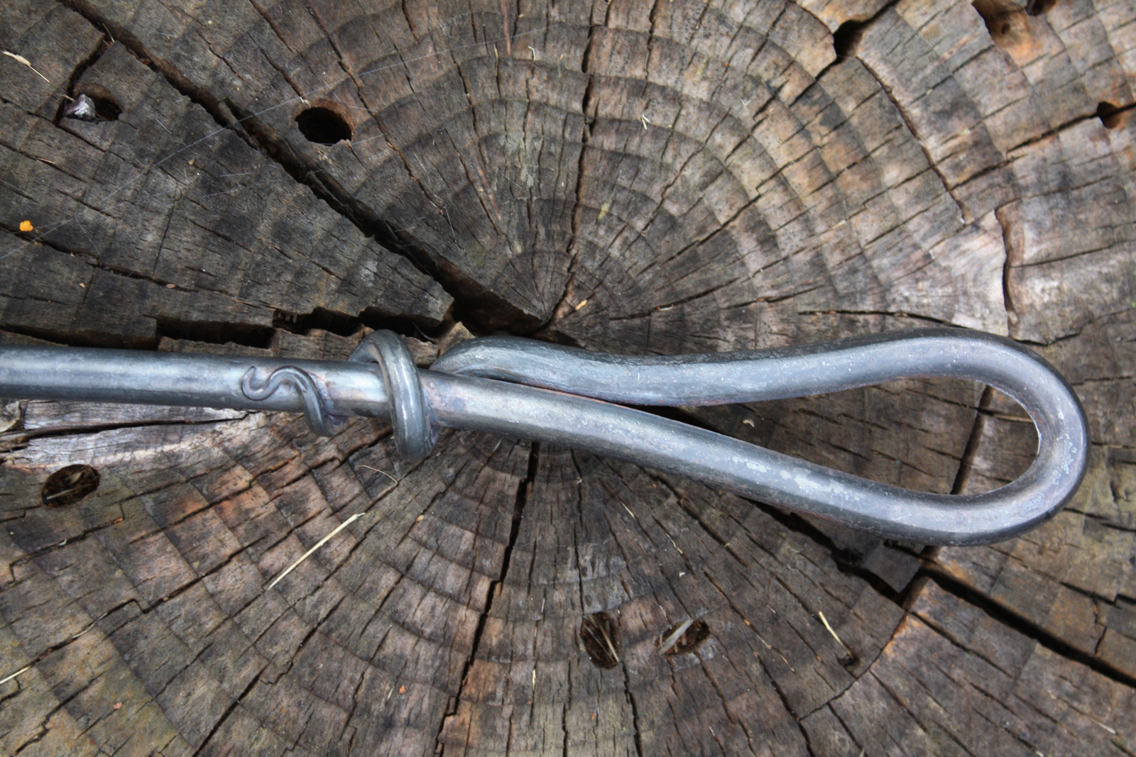 Hand forged fire pit poker with elegant loop handle.